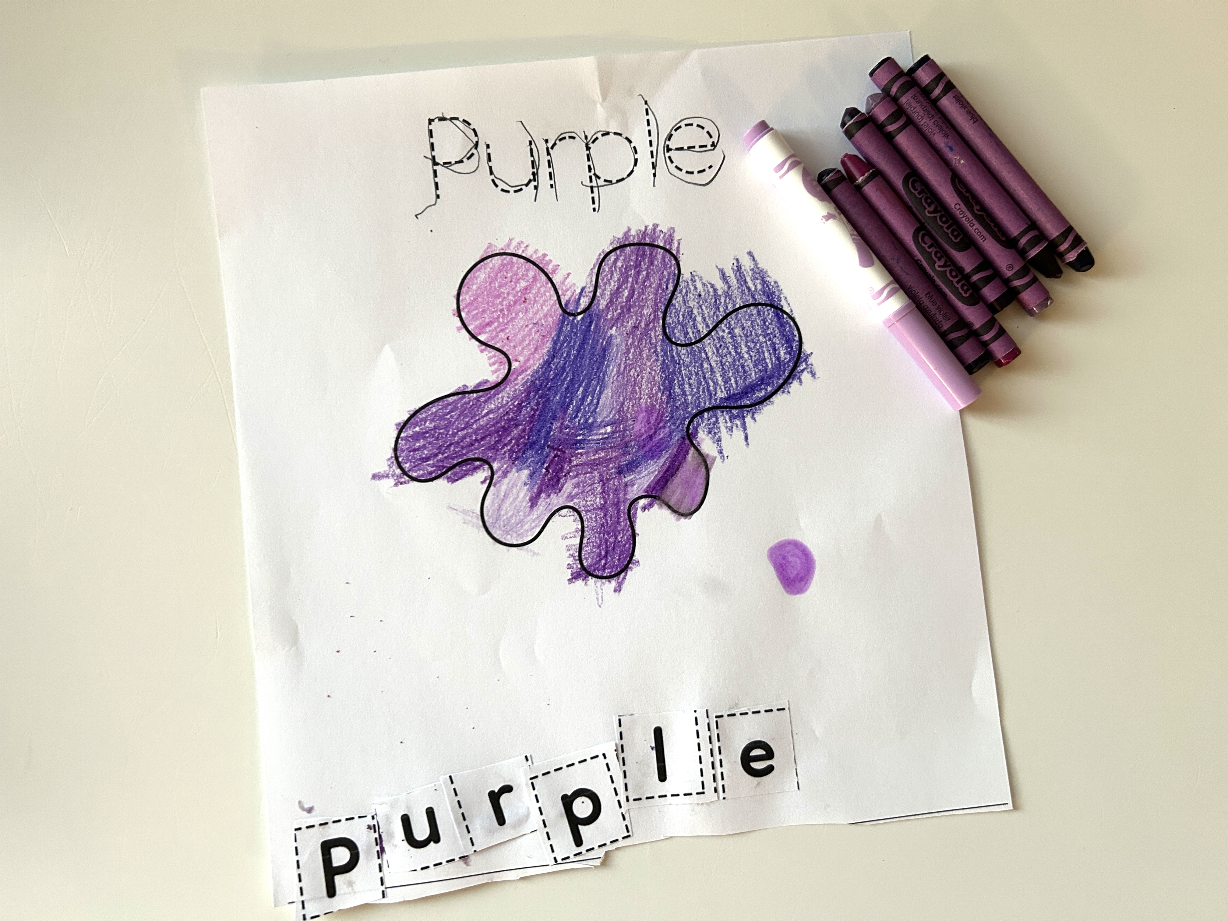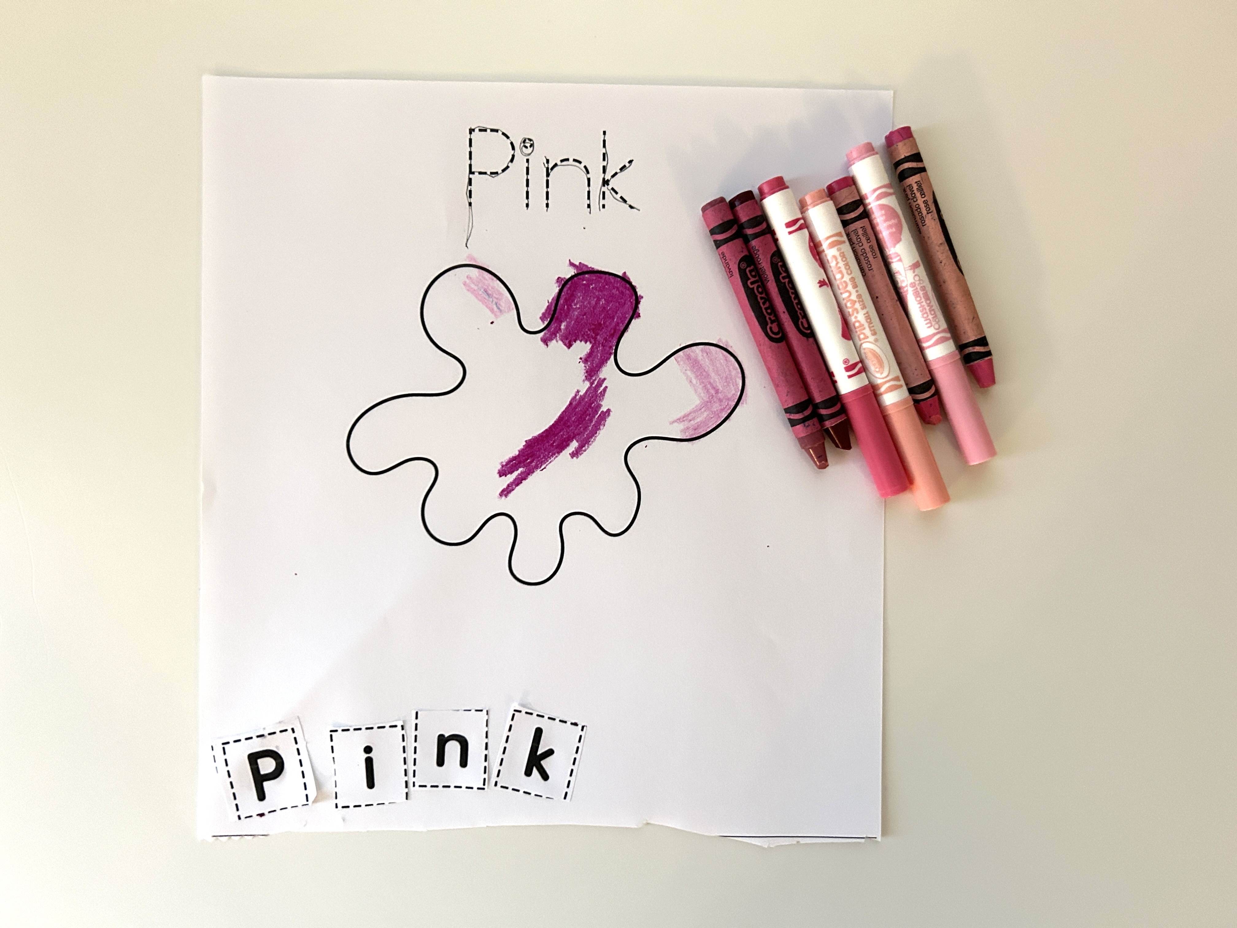 Once all the letters had been glued to form the colour word, we did another mini scavenger hunt in our crayon and marker box! I had the kids look through to find as many different markers and crayons they could of the current colour we were on. We have a decent collection of crayons and markers, so they usually found about 3-6 versions of each colour. They then chose one (or more!) to colour the paint splash on the page. If your little one isn't into colouring, some other options include painting or ripping up a piece of construction paper into small pieces and gluing them down.