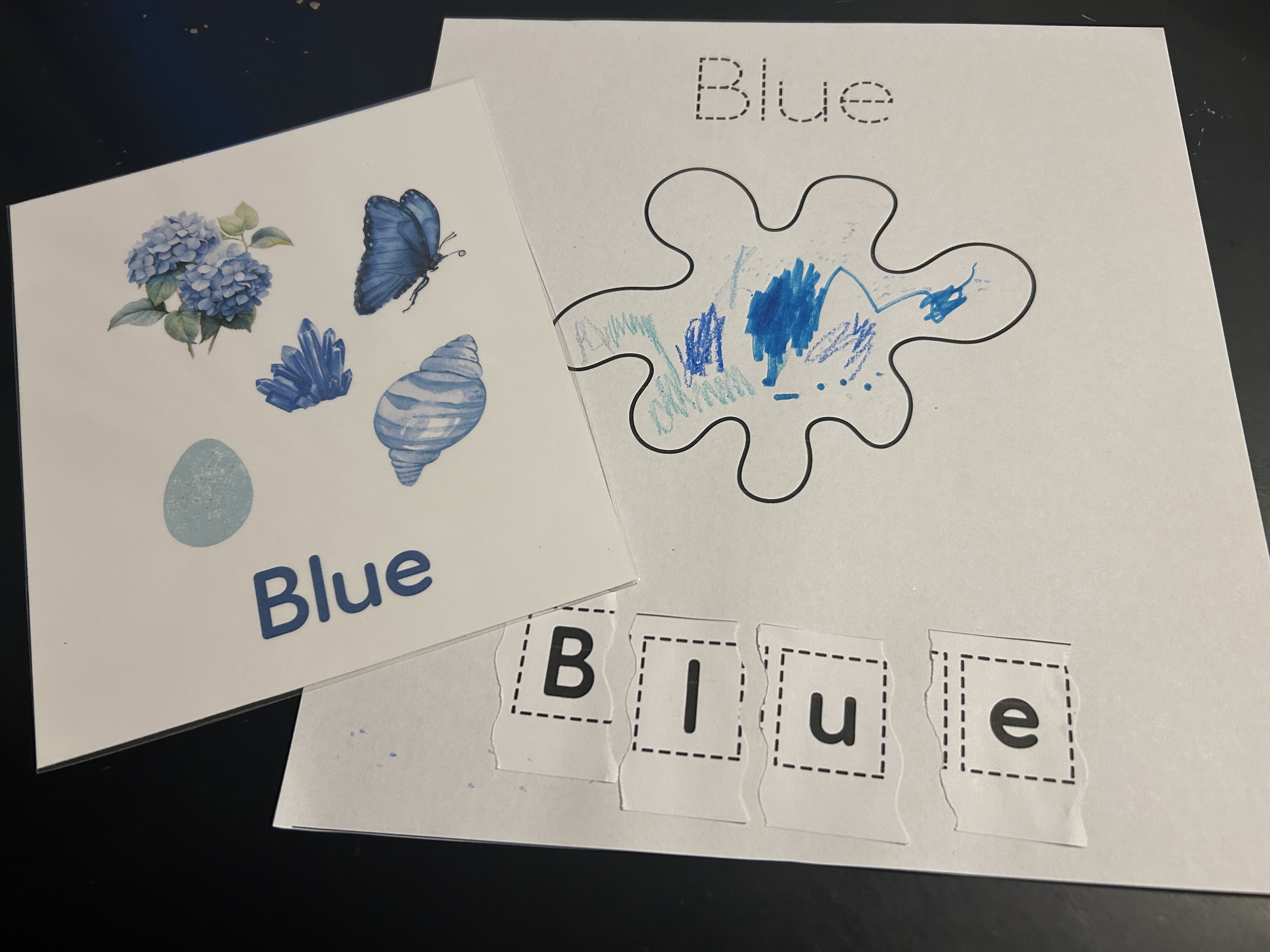 After the scavenger hunt, we settled down to do the cut and paste activity. For my youngest, who is just learning how to use scissors, I cut the strip of letters off the page first. Then, I held the strip for her while she snipped off each letter. Single snips like this are a great way to get started on using scissors! We did this for the first few colours and by the time we were on the last (9th) colour, she was doing this part all by herself!