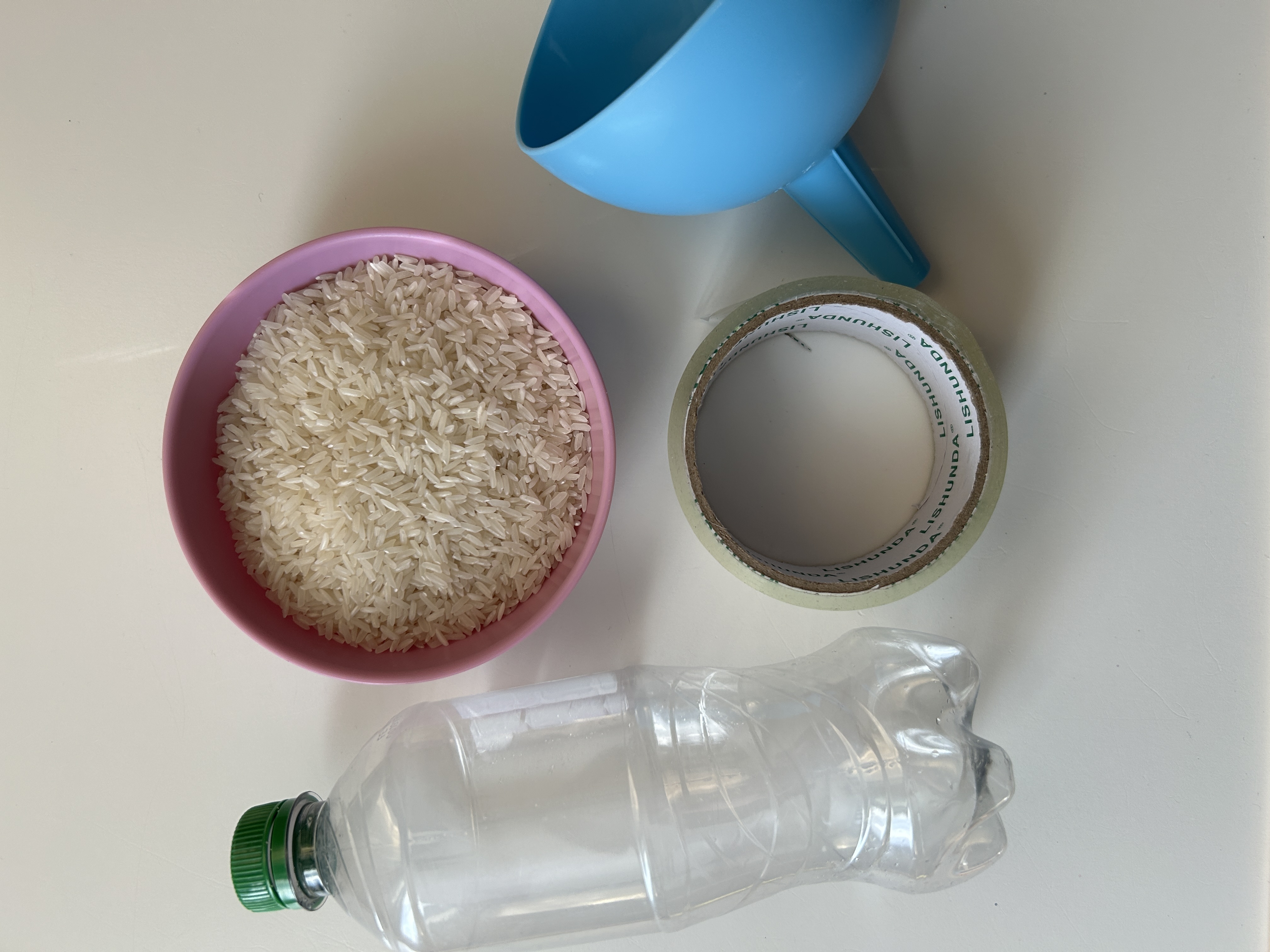 1. Pour: Start by using the funnel to pour the dry rice or beans into the empty bottle. Your child can help with this step. You'll want the bottle to be about half full. To avoid mess, ensure the water bottle is stable by holding it as you pour so that it does not fall over.