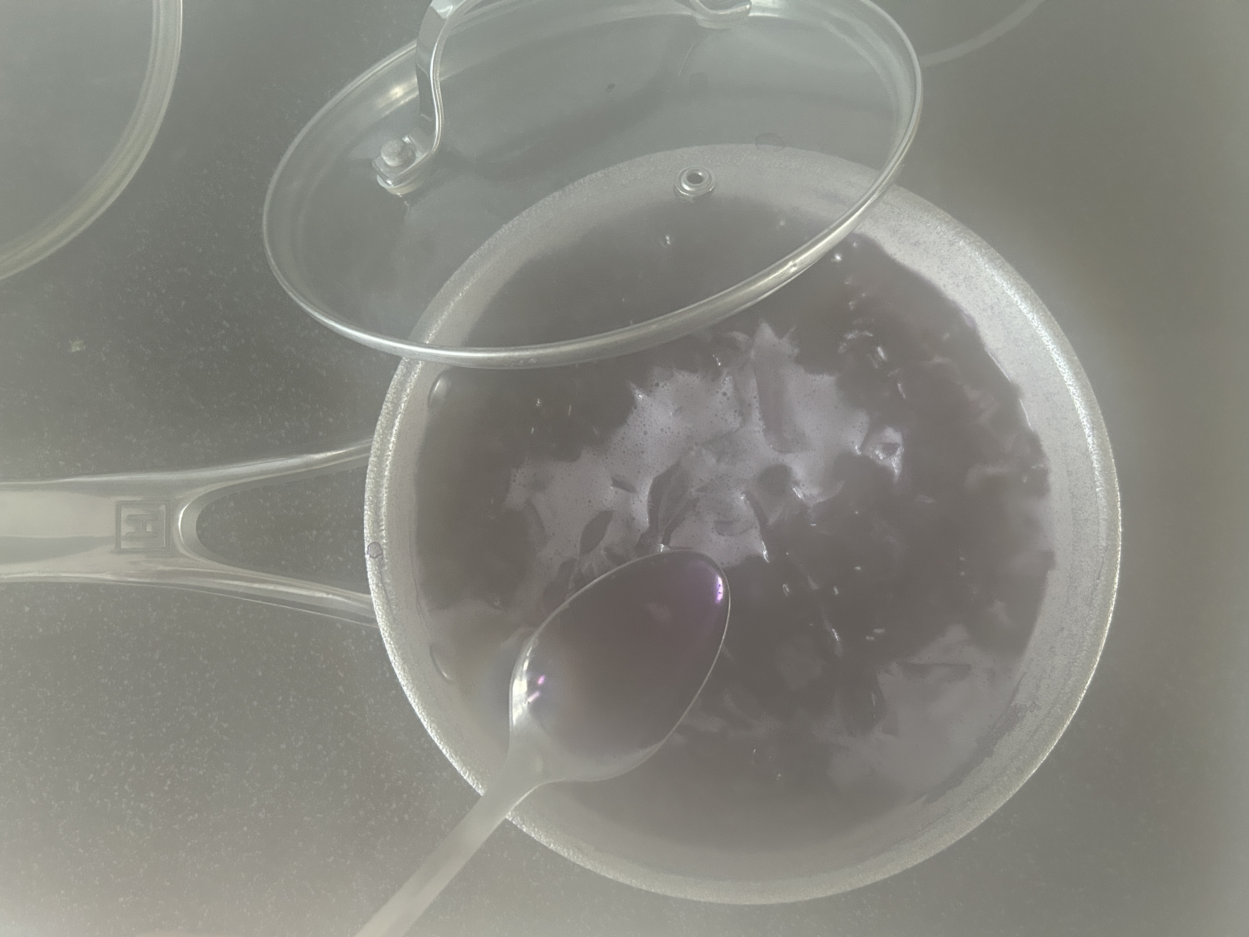 After boiling 15-18 minutes, you should notice the water is coloured. Strain the ingredients out of the water and save the coloured water in a bowl or container. It wasn't easy to get a picture of this step, the best I have is steamy boiled cabbage. The water will still be very hot, so keep little ones at a safe distance as you complete this step.