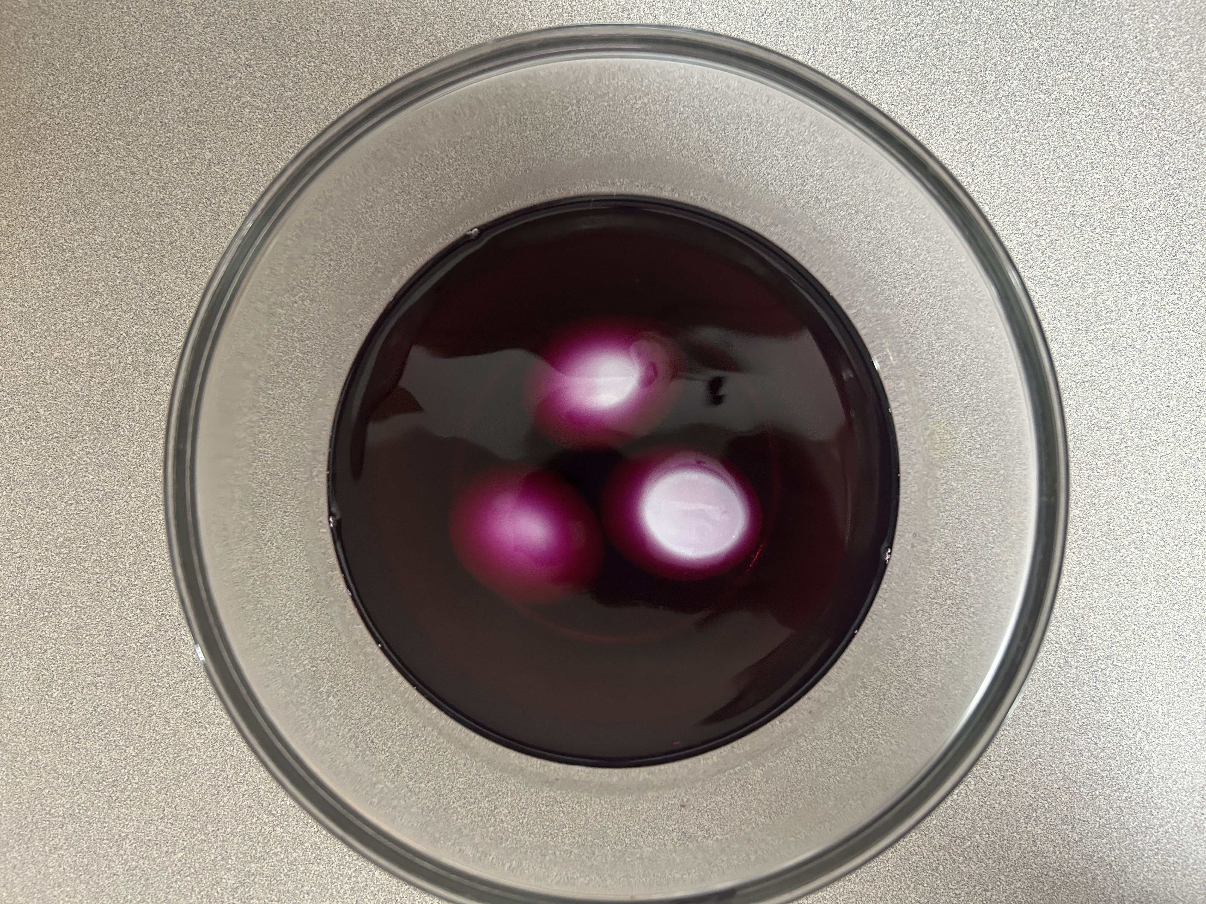 Once liquid is room temperature, add eggs carefully and ensure they are fully submerged. Let sit until desired colour is reached. We did 2.5 hours. If leaving for an extended time, put in refrigerator to keep eggs fresh. You can see in the photo above that we didn't have enough colour to fully submerge the eggs in this bowl. I could have tried a different container, but we decided just to rotate the eggs occasionally to ensure all sides were coloured. This is a great step for little ones to help with!