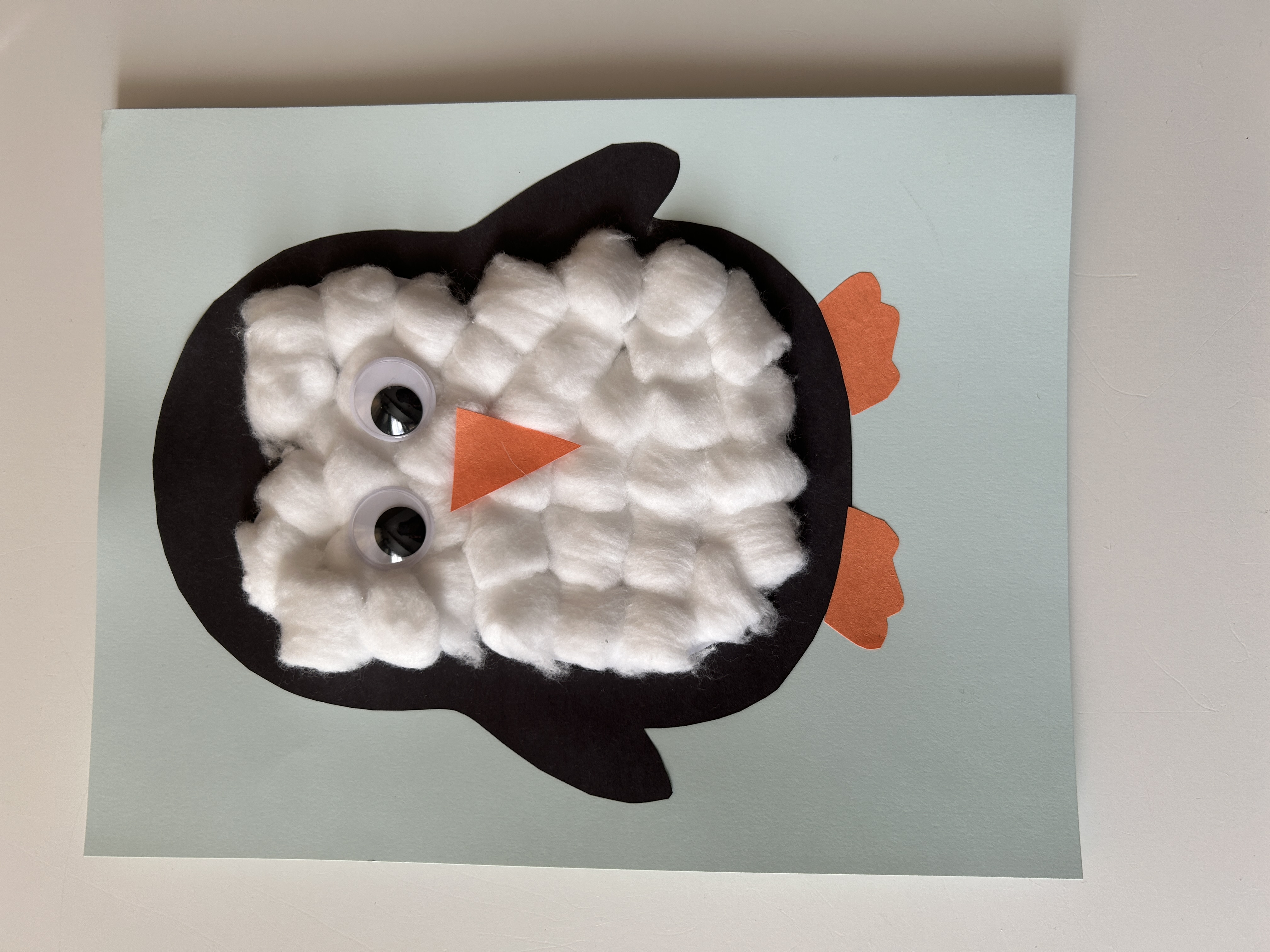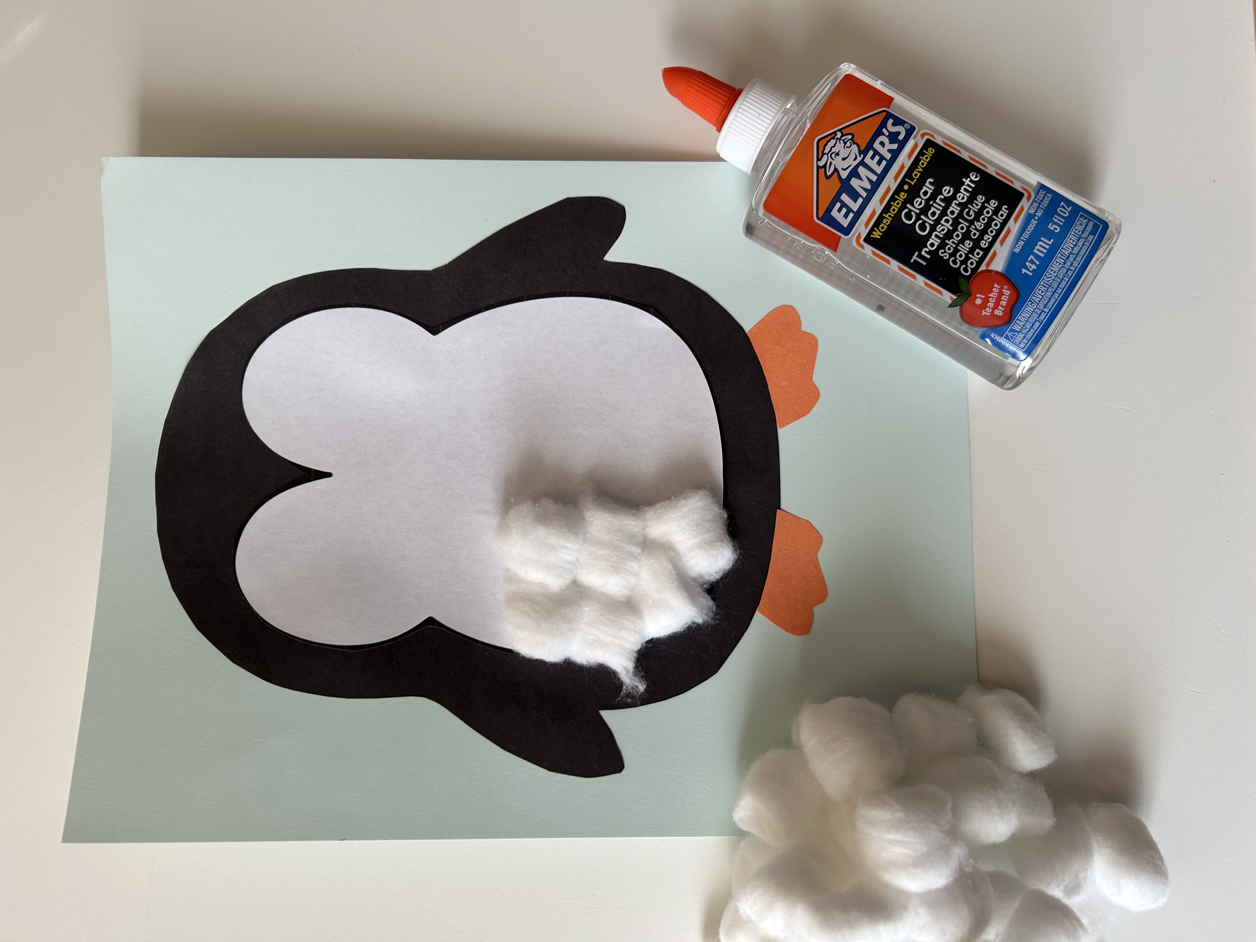4. Glue: Glue the feet on the bottom of the penguin. Next, begin to glue the cotton balls to fill in the middle of the penguin. You can show your child how to squeeze a dab of glue from the bottle, or squeeze out some glue onto wax paper for them and then have them dip the cotton ball into the glue before placing on the penguin.