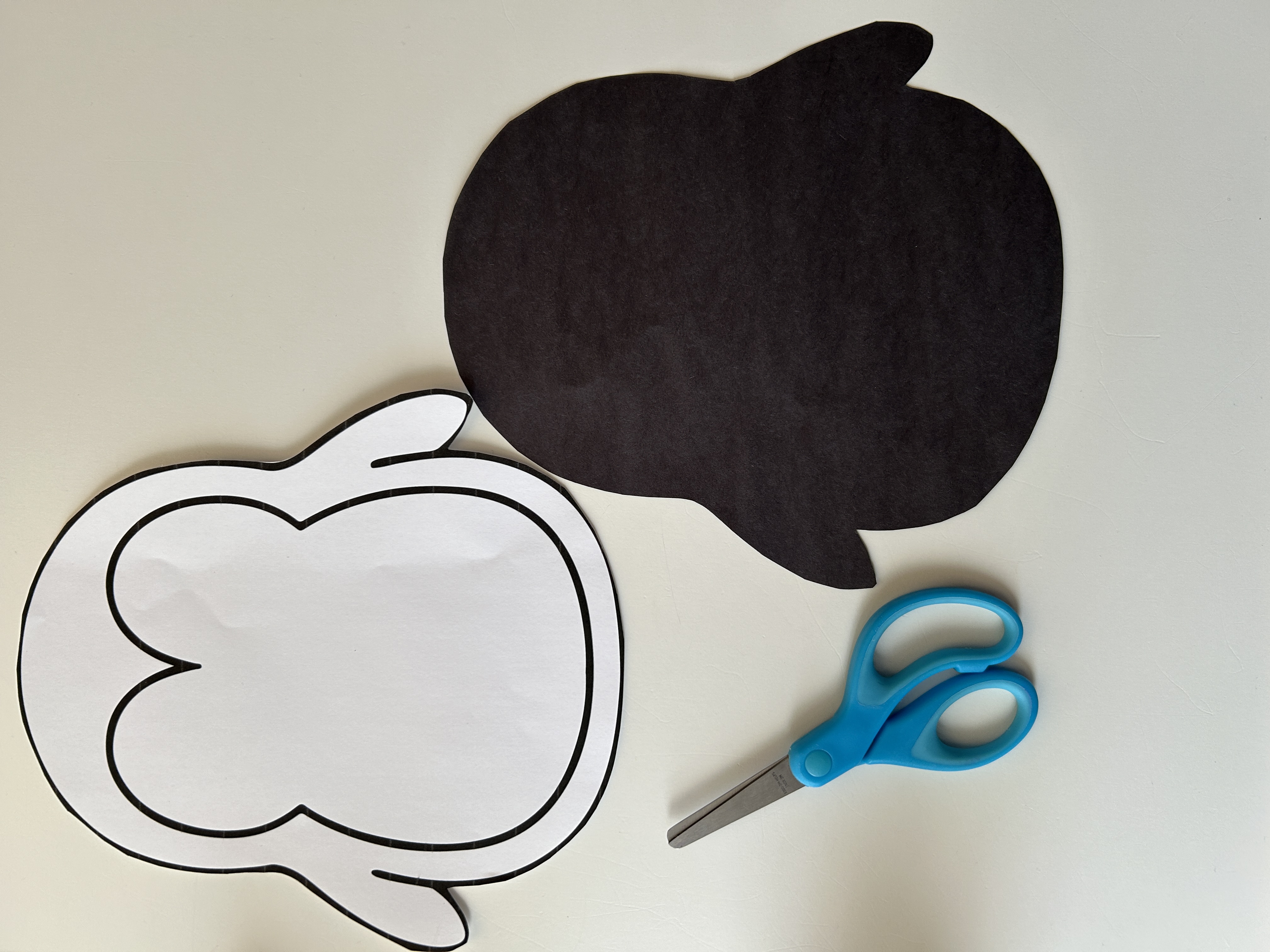 1. Cut: Start by cutting out a penguin-shaped outline from the black paper. You can use a template for this, or create your own - you really just need a large oval shape with some flippers on each side! If your child is comfortable using scissors, you can use a white crayon to draw the outline on the black paper and have them cut. Or, you can pre-cut the penguin shape for them.