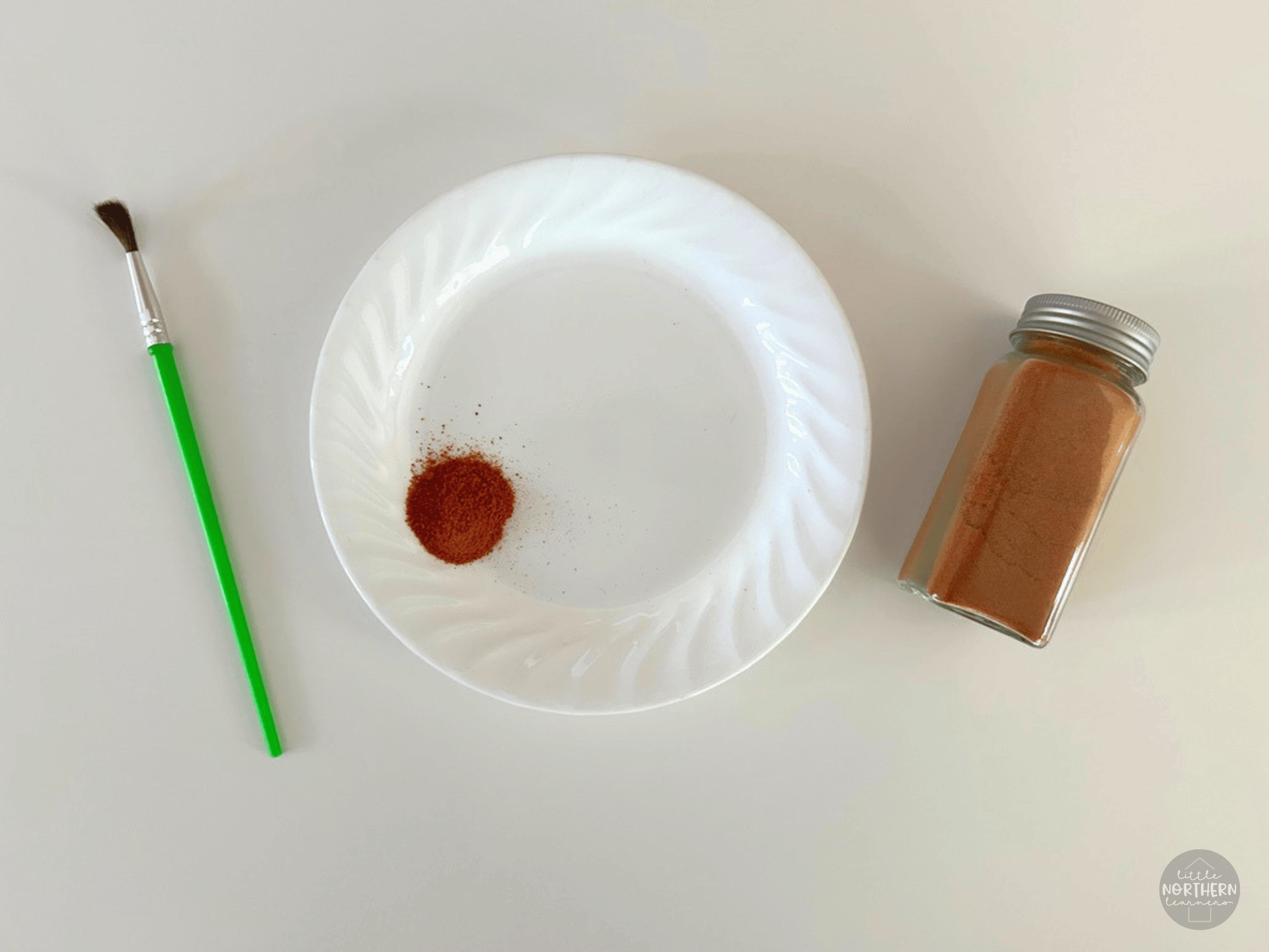 1. Prep: Start by pouring out a small amount of spice onto a plate or other surface. You really don't need much, about 1/2 tsp is enough to get started, and you can add more as needed. Let your little one help you measure and pour for practice!