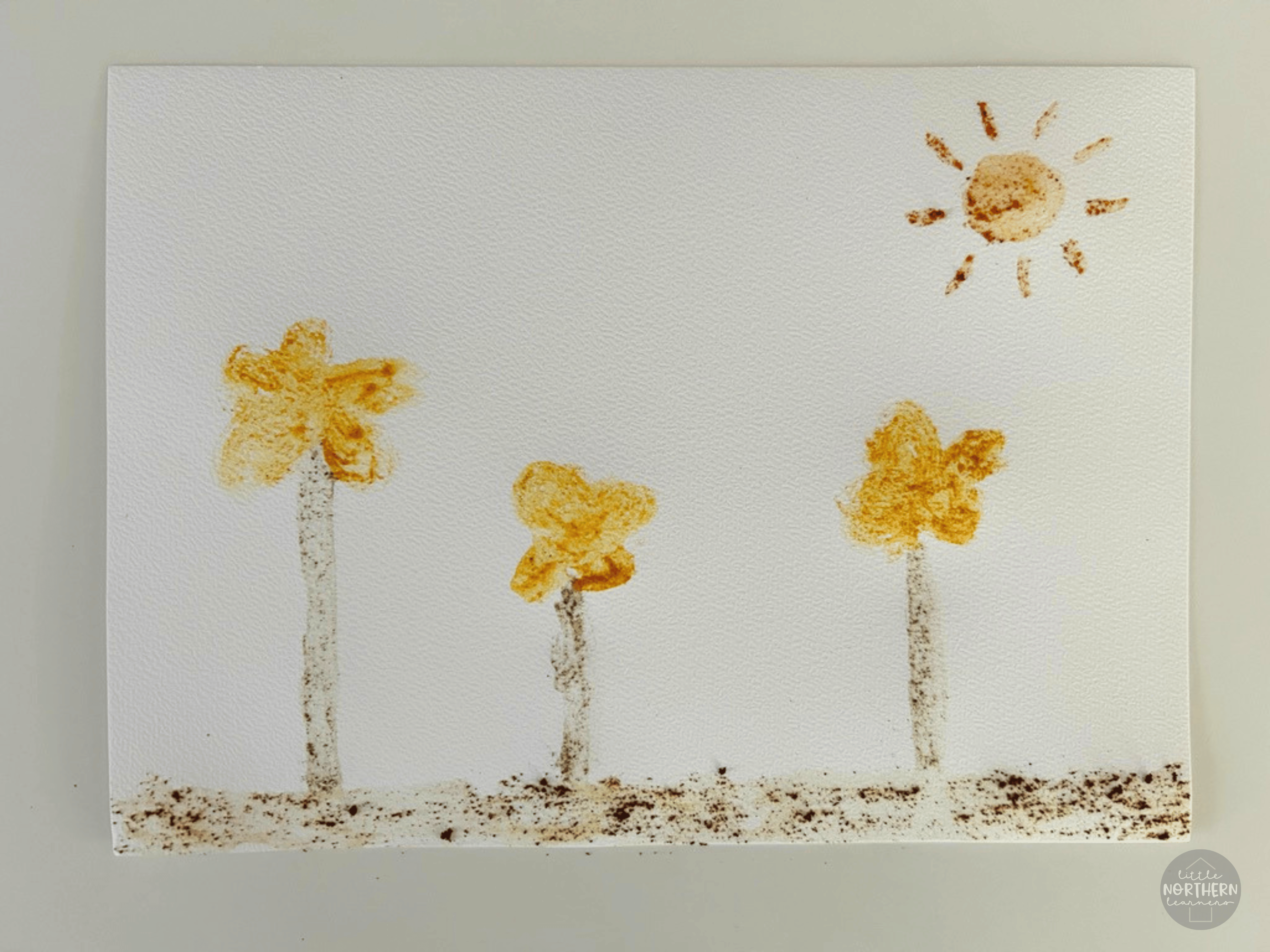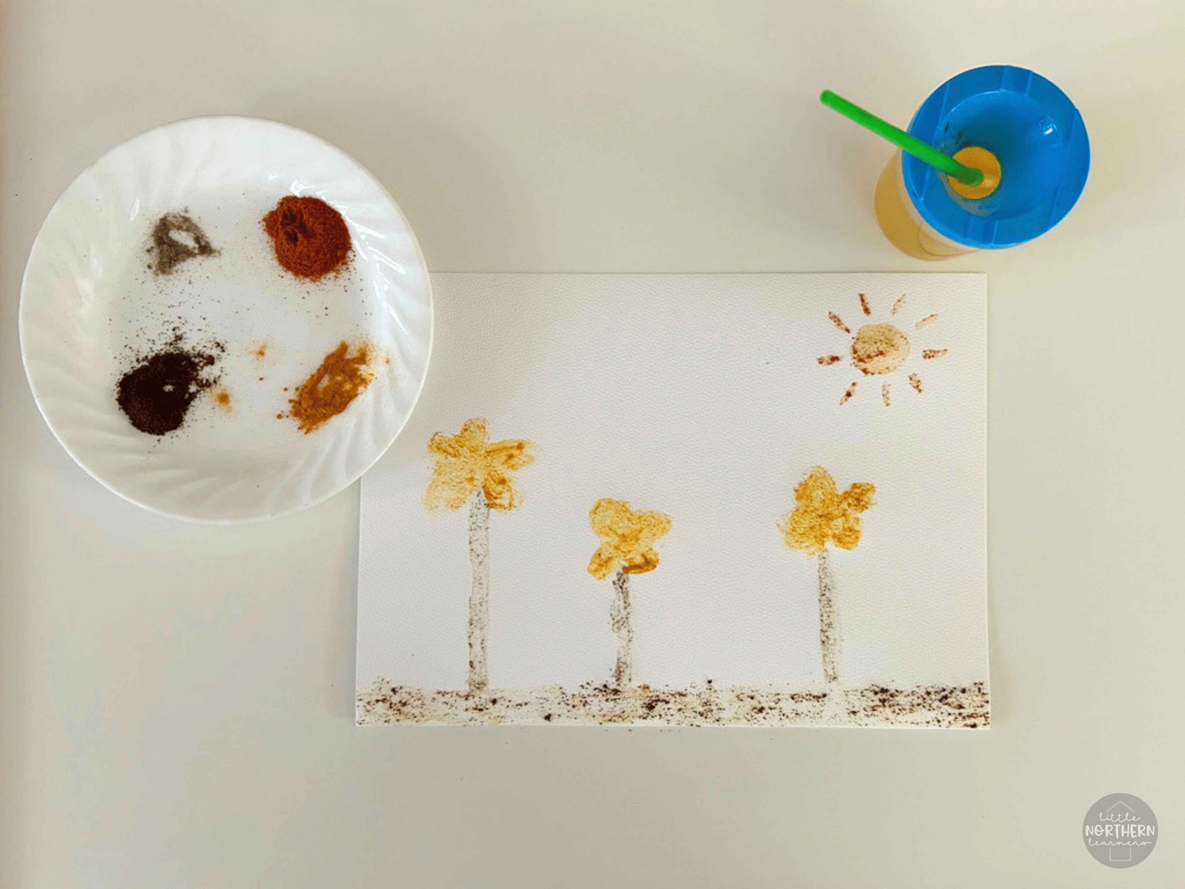 In the photo above, we used paprika (orange sun), turmeric (yellow flowers), sage (green stems), and cloves (brown soil).